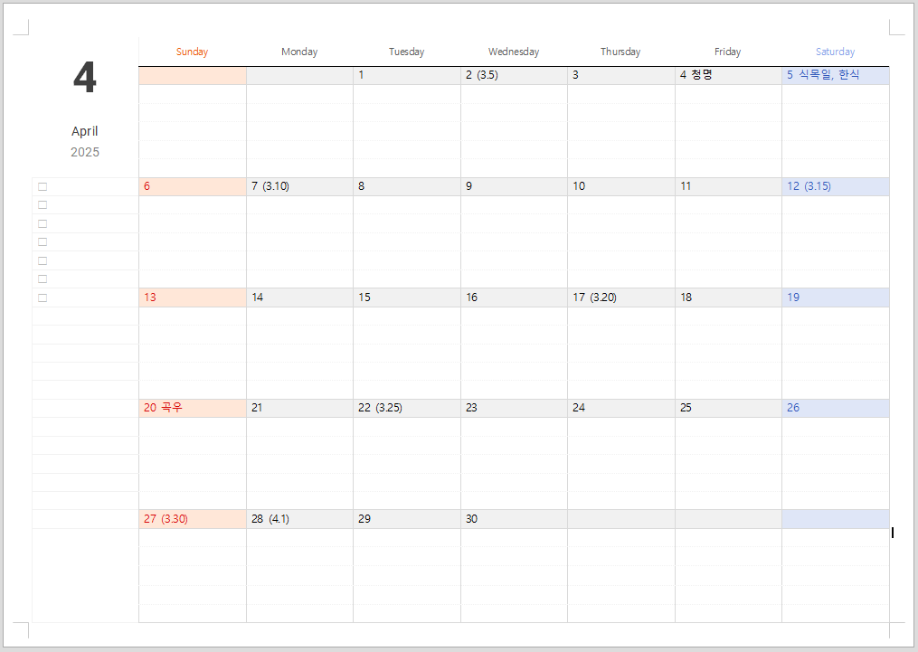 2025년 4월 달력 프린트