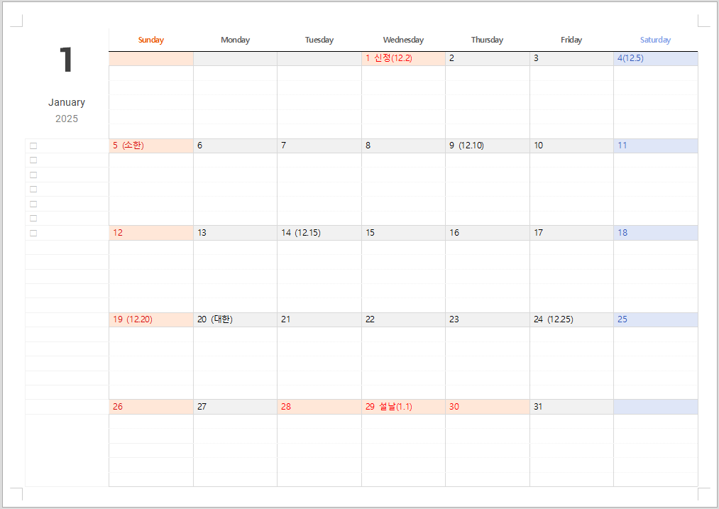 2025년이 다가오면서 2025년 달력을 찾으시는 분들이 많으신데요, 2025년을 잘 계획하는 방법은 2025년 플래너를 작성하는 일이 아닌가 합니다. 플래너겸 달력을 사용할 수 있는 2025년 달력 파일을 준비했습니다. 음력 달력이 필요하신 분들을 위해 음력 날짜를 5일 간격으로 추가한 pdf 달력 파일을 무료로 다운로드 받을 수 있습니다.