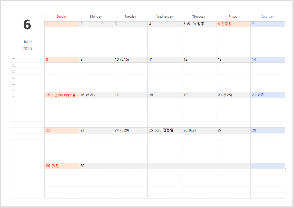 2025년 6월 달력 프린트