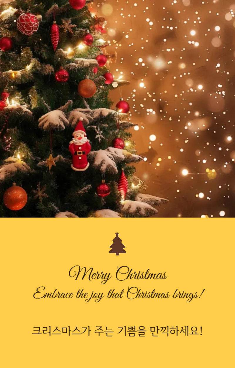 사랑과 행복이 가득한 크리스마스를 기원합니다. 이 특별한 날이 당신에게 많은 축복을 안겨주길 바랍니다!