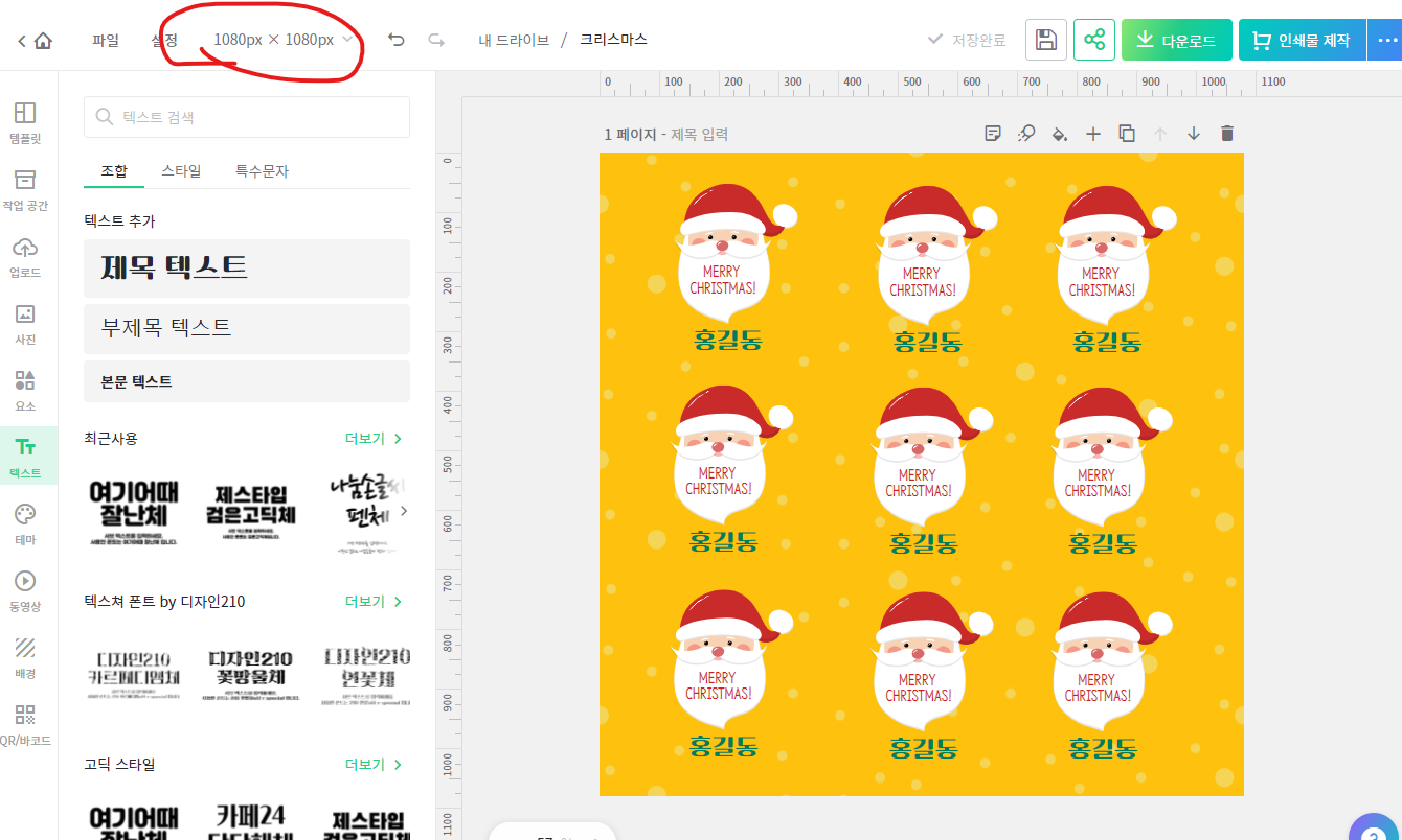 위에 있는 방법처럼 A4용지로 캔버스를 설정하고 프린트할 크리스마스 라벨 도안을 여러개 복사놓고 PDF로 다운로드 받으면 따로 작업해 줘야 하는 것이 없어요.