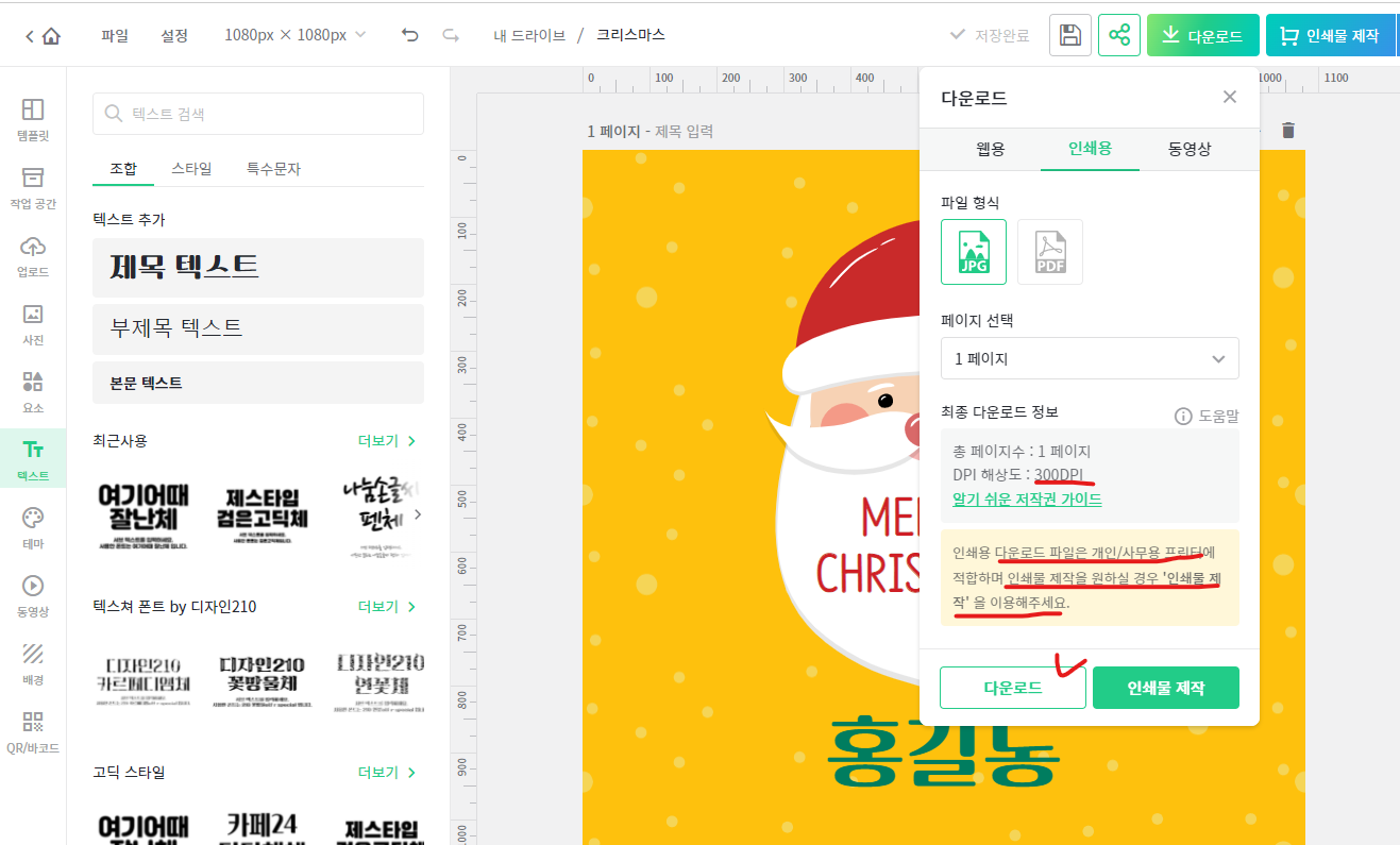 5) 수정을 다 했으면 인쇄를 위해서 다운로드 받으면 됩니다.