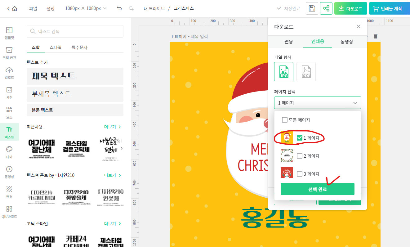 인쇄용을 클릭한 후, jpg를 선택합니다. 페이지 선택에서 인쇄하고 싶은 이미지만 선택하세요. 저는 1페이지를 선택했습니다. 그리고 선택완료 해주세요. 이 방법은 이미지 파일 하나를 다운로드 받을 때에요. 여러개 이미지 파일 편집 방법은 아래에 있어요.