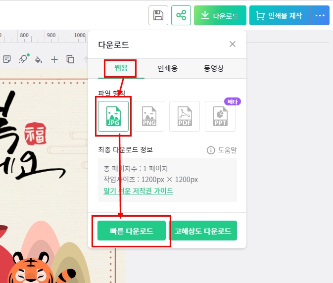 다운로드 클릭 → 웹용 선택 → JPG 선택 → 빠른 다운로드를 클릭해서 다운로드 받으세요.