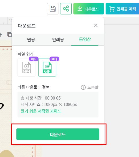 미리캔버스 움직이는 이미지 gif 다운로드 순서 : 다운로드 → 동영상 → GIF → 다운로드