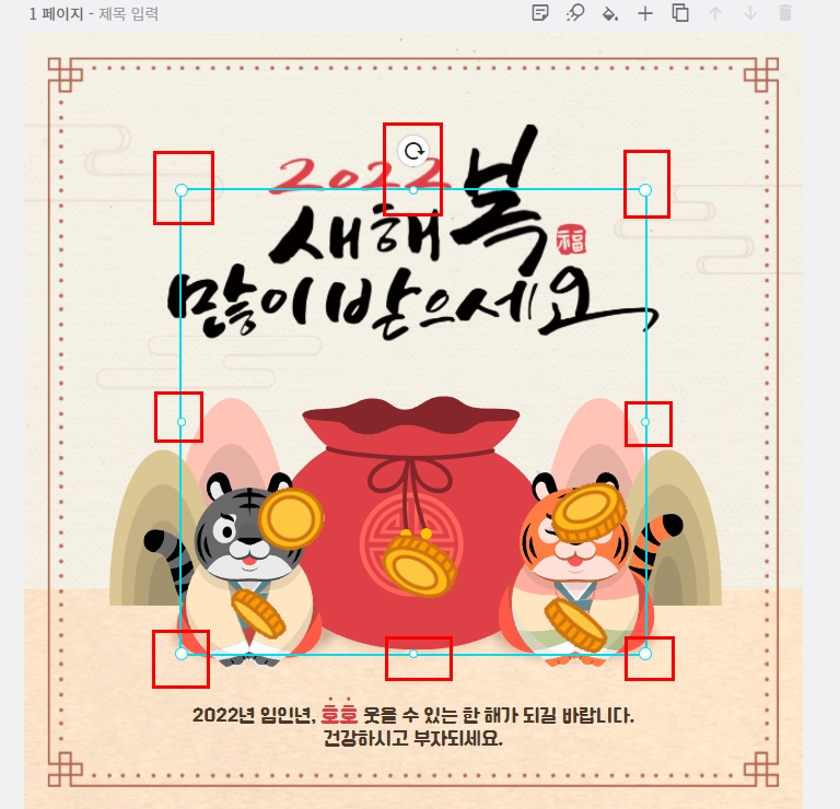 모서리와 변에 조절점이 보입니다. 이것을 마우스로 클릭 드래그해서 크기를 조절해주세요.