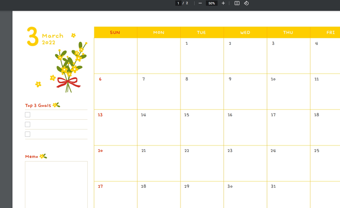 굿노트용 2022년 3월 달력, 3월에 피는 개나리를 연상해서 만들었어요.