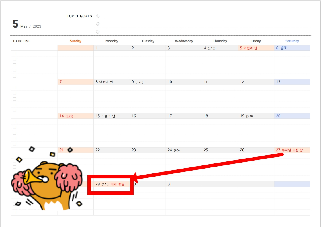 공유된 2023년 달력 프린트 파일 pdf는 상단에 목표 3가지를 적을 수 있도록 되어 있어요.